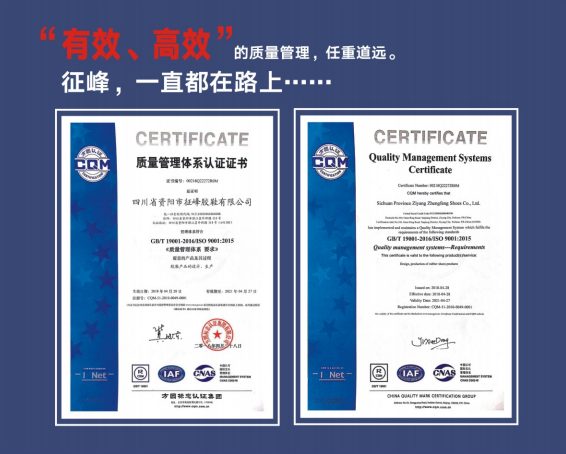 质量是企业生命线,售后是我们不变的承诺。企业严格执行“三包"规定,让消费者穿着放心,公司品类较多,冷粘系列,硫化系列等,都将按不同品类实行“三包"规定,做好“修、换、退、赔"的质量承诺,质量承诺是我们不变的信念。